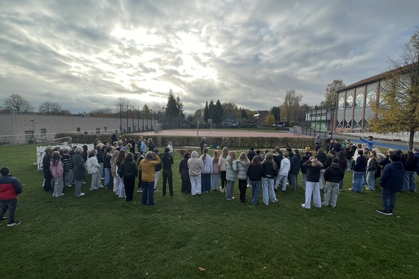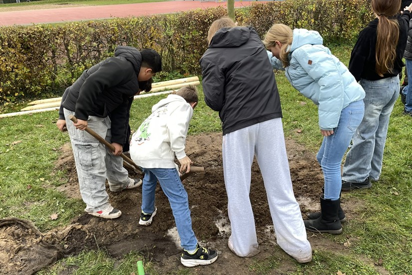 Die Pflanzaktion leitete Josh Geertz vom BUND. Rund fünfzig Schüler der fünften bis siebten Jahrgangsstufe hörten seiner kurzen Einführung aufmerksam zu. „Wenn ihr später mit euren eigenen Kindern hierherkommt, könnt ihr sagen: Den haben wir damals gepflanzt“, sagte Geertz. Jeweils einige Kinder aus jeder Klassenstufe übernehmen eine Patenschaft. Nach den ermunternden Worten von Geertz gruben sie voller Eifer mit Spaten drei metertiefe Löcher. Biologielehrerin Martina Malina und Kollege Andreas Jungjohann lobten das Engagement der Schüler. „Es ist klasse zu sehen, dass die Kinder selbst an diesem Projekt beteiligt sind und das Wachstum vom Pflanzen bis zum Gedeihen miterleben können.“