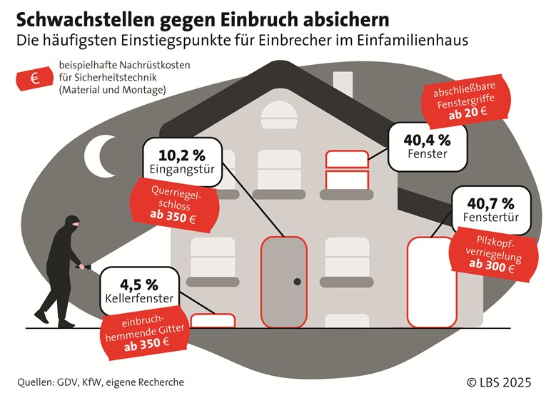 Abhilfe schaffen kann der Einbau von einbruchhemmenden Türen und Fenstern. Dabei werden Schwachstellen wie Türblatt, Rahmen, Verglasung und Schloss verstärkt. Bewegungsmelder und ein Wachhund schützen das Grundstück. Noch mehr Sicherheit bieten Alarmanlagen und Smart-Home-Systeme. Bei der Auswahl der Produkte und Maßnahmen gibt es Rat von Polizei und Fachbetrieben. Die Finanzierung einbruchhemmender Maßnahmen wird von der Kreditanstalt für Wiederaufbau (KfW) über das Programm „Altersgerecht Umbauen (159)“ mit zinsgünstigen Krediten bis zu 50.000 Euro unterstützt. „Gut geeignet für eine Finanzierung sind auch die Modernisierungskredite der Landesbausparkassen“, sagt Tilman Sanner von der LBS.