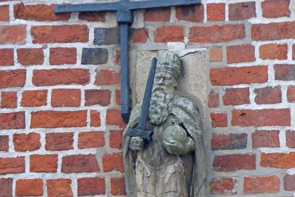 Hier sieht man es fast noch ein bisschen besser: Ein Roland kann er kaum sein, dagegen spricht auch sein Platz an der Außenseite des Schlosses, steht der Roland doch für das bürgerliche Marktrecht. Und auf seinem Kopf trägt er eine prächtige Krone, er ist gehüllt in einen reich verzierten Mantel und gekleidet ist er in eine römische Uniform. In der linken Hand hält er die Weltenkugel, was auch immer er in der rechten Hand hatte, ist verloren gegangen, es könnte aber ein Szepter gewesen sein. Die Rolandsstatuen, die man so finden kann, ob in Bremen oder in Quedlinburg, tragen alle Schild und Schwert sowie Kleidung und Schuhe eines Ritters. „Allein das weist darauf hin, dass es gar kein Roland sein kann“, sagt Tomke Stiasny, „vielmehr muss es ein Kaiser sein, so wie er gekleidet und ausgestattet ist. Auch Krone und Weltenkugel deuten darauf hin. Ebenso wie der lange, dichte Bart, der eines Kaisers würdig wäre. So wie er hier steht, so stellte man damals einen Kaiser dar.“ Aber der Haken: Man könnte meinen, der Herr sei barfuß – „und einen Kaiser ohne Schuhe abzubilden, das wäre niemals in Frage gekommen.“ Schaut man genauer hin, erahnt man zwar Zehen, man kann aber auch an seinem rechten Bein eine Art Schienbeinschoner finden. Der könnte sehr gut ein Teil einer römischen Wickelsandale sein, die prima zu seiner Uniform passen würde – damals war es schick, sich in der Mode römischer Kaiser portraitieren zu lassen. Also ganz barfuß scheint er nicht zu sein. Vielleicht hat die Wickelsandale der Zahn der Zeit schon abgenagt, bevor der Herr ins Schlossinnere gerettet werden konnte.
