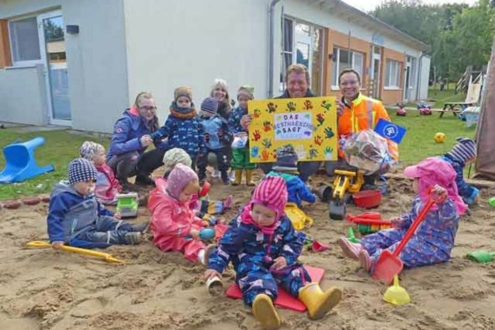 Diese neue Baustellen-Backstuben-Wüsten-Seelandschafts-Sandkiste konnte die Krippe Nesthäkchen des Deutschen Kinderschutzbundes des Kreises Ostholstein dank einer Riesenspende einer Süseler Familie anschaffen. Die dazu benötigten 1.800 Euro hat die Familie Rumpel in Gemeinschaftsleistung überwiesen – „dafür sind wir sehr dankbar“, sagt Barbara Stosik, die Leiterin der Süseler Krippe, „das wäre sonst nicht möglich gewesen. Denn gerade die Einfassung ist unwahrscheinlich teuer – und die alte aus Holz war teilweise kaputt und einfach auf.“