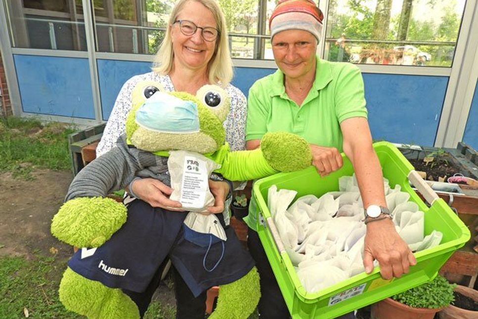 Eutin (aj). Aufstehen, Zähneputzen und frühstücken und dann gut gestärkt in die Schule. Klingt selbstverständlich? „Leider ist es aber so, dass es eine Reihe von Kindern gibt, die ohne Frühstück oder nur mit einer Kleinigkeit im Magen das Haus verlassen und auch für die Pause nichts oder nur Naschereien im Ranzen haben“, berichtet Petra Stock. Die Pädagogin unterrichtet Sport an der Arnesbokenschule in Ahrensbök und an der Gustav-Peters-Schule in Eutin und sie kennt die Folgen eines ausgefallenen oder unzureichenden Frühstücks: „Man sieht, wie die Kinder den Vormittag über regelrecht abbauen“, so beschreibt sie ihre Beobachtungen. Das ist nicht gesund und auch das Lernen wird mühsam. Wer Petra Stock kennt, weiß, dass sie ihr das Wohlergehen aller Kinder am Herzen liegt - und dass sie etwas dafür tut. Sie ist Herz und Motor des Handballvereins HSC Rosenstadt, der sich das Anliegen „Sport für alle Kinder“ nicht nur auf die Fahnen geschrieben hat, sondern aktiv und unermüdlich daran arbeitet, diesen Anspruch einzulösen. Und weil der reguläre Trainingsbetrieb nicht stattfinden konnte, blieb Zeit, um Frühstück zu machen. Frühstück für die Schulkinder: Vier Wochen lang versorgte Petra Stock zwei Klassen der Eutiner Grundschule am Kleinen See. Das hieß: Vorbereiten, was Kraft gibt und gut schmeckt, Zutaten und Inhaltsstoffe auflisten und ausdrucken, für jedes Kind ein Tütchen packen und die Pausenmahlzeit pünktlich und gut gekühlt in die Schule zu liefern, wo sie zum gemeinsamen Frühstück um 8.30 Uhr bereits von den begeisterten Kindern erwartet wurde. Wer einmal dabei sein darf, erlebt Frühstücksfreude pur - und ein echtes Schulidyll. Gegessen nämlich wird draußen mit Blick auf die kleine Blumenwiese für die Insekten. Auf dem Rasen gibt es nicht nur Hochbeete und Kartoffelpflanzen, im Kreis stehen auch Holzstämme, so dass die Frühstückspause zum Picknick werden kann. Petra Stock und der große Plüsch-Frosch Raak, das Maskottchen des HSC, werden mit großem Hallo von den Mädchen und Jungen der zweiten Klasse von Barbara Kleinmann begrüßt. „Total cool“, findet Raffi, was in seiner Tüte steckt: Eine Banane, Minimöhrchen und als besondere Stärkung Früchtebrot und köstlicher Erdbeercrumble. Zufriedene Gesichter, wohin man schaut. Fina erzählt: „Gestern gab es Naturjogurt im Glas mit Müsli und Himbeere. Das war auch so lecker!“ Und wenn es nach Bayan ginge, würde das Projekt nach der vierwöchigen Testphase nicht enden: „Es wäre super, wenn es immer so ein Frühstück gäbe. dann müsste man auch die Brotdose nicht mitnehmen“, sagt sie.