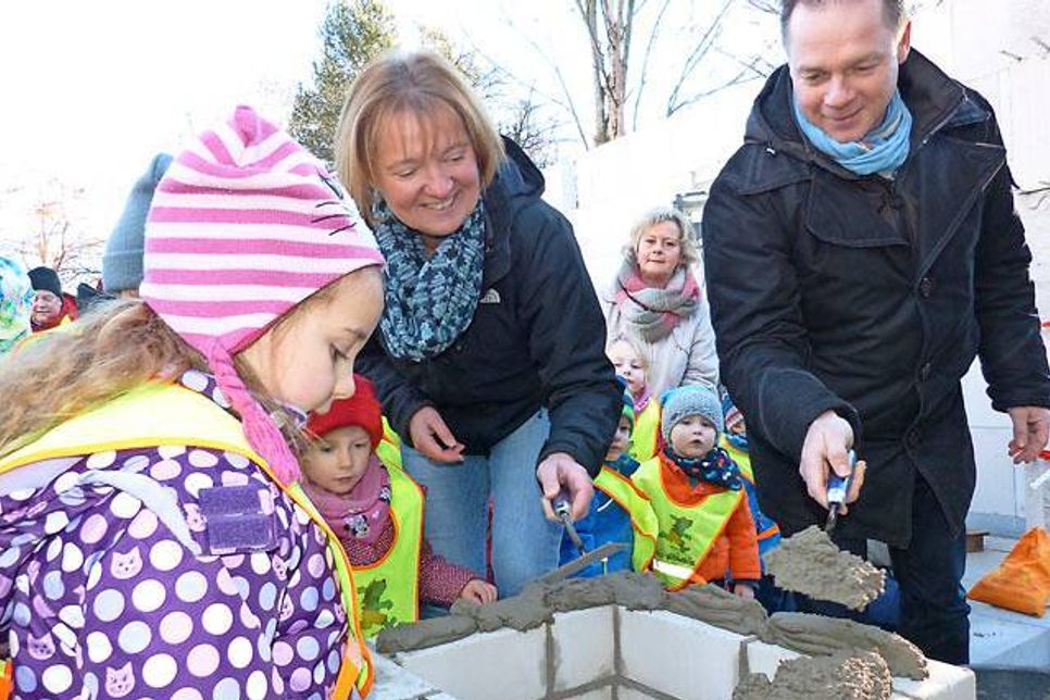 Eutin (ed). Nur einmal und ganz ausnahmsweise durften sie alle durch die (noch eisekalte) Küche kommen, die Löwenzähnchen und Gänseblümchen vom Kindergarten Kamp und Frösche, Eichhörnchen, Delphine und die Kleinsten, die Mäuse aus dem evangelischen Kindergarten, der, als er noch stand, Bischof-Wilhelm Kiekbusch-Kindergarten (BiWiKi, wie er liebevoll genannt wurde) hieß. Denn am Montag war ein besonderer Tag für die Lütten – der Grundstein für ihren neuen Kindergarten wurde gelegt und außerdem sollten sie endlich erfahren, wie er überhaupt heißen würde. Deshalb waren sie alle dahin gewandert, wo mitten in Eutin gerade groß gebaut wird. Und weil es noch keinen richtigen Eingang gibt für den neuen Kindergarten im Dr. Wittern-Gang durften die Kinder (und die Erwachsenen) eben nochmal durch die Küche – gleich daneben wird dann auch der Eingang sein. Und genau hier wurde die Zeitkapsel im Grundstein versenkt – falls in vielen, vielen Jahren das Haus einmal abgerissen würde, erklärte Beate Brand, die Leiterin des KiTaWerkes der Kirche, könnten die Leute dann sehen, was das für ein Haus gewesen sei, wer darin was gemacht habe, wann und wieso es gebaut wurde. Dafür hatte Christiane Hoyer, die Leiterin des ehemaligen Bischof Wilhelm-Kiekbusch-Kindergartens ein Foto von allen Kindern und Erzieherinnen gemacht und mitgebracht – das kam mit zwei Gemeindebriefen in die große Zeitkapsel, damit die Leute einmal wüssten, was so in der Kirchengemeinde los war. Die Baupläne kamen ebenso rein wie die Bunte Kinderbibel natürlich, ein Segenswunsch der Stadt Eutin und dann (neben dem Playmobil-Martin Luther von Pastorin Maren Löffelmacher) das Allerbeste: Der neue Name des Kindergartens, den hatte Propst Süssenbach mitgebracht, nachdem er in einem umfangreichen Prozess aus 178 vielfältigen Vorschlägen der Bürger und Bürgerinnen, der Kinder, Eltern und Mitarbeiterinnen ausgewählt worden war. Und als der Propst den Namen aus dem versiegelten Umschlag zog und vorlas: „Evangelische Kindertagesstätte Schatzkiste“, brachen die Lütten in fröhlichen Jubel aus, denn das war ihr Wunsch und Vorschlag gewesen. „Ich sehe schon, das ist der richtige Name für Euch“, lachte der Propst. Er freue sich sehr, dass man mit der Stadt über den Bau einig geworden sei, denn „Kinder halten Kirche und Glauben lebendig, aber auch eine Stadt wie Eutin. Gut also, dass die Kinder im Herzen von Eutin leben, spielen, lernen und mit Gott groß werden.“ 2011, als die Krippe eröffnet wurde, habe der Brandschutz einige Verbesserungsmaßnahmen angebracht – und man habe über eine Grundsanierung anchgedacht, erinnert sich Pastorin Maren Löffelmacher, aber das hätte sich nicht rentiert. Also wurde der Seit dem vergangenen Sommer sind die Kinder des Bischof Wilhelm Kiekbusch-Kindergartens nun nicht mehr in ihren alten Räumen – längst ist der alte evangelische Kindergarten abgerissen. Die Abriss- und die Bauarbeiten haben die Lütten gespannt verfolgt, schließlich müssen sie ja sehen, wo sie demnächst „zuhause“ sein sollen. Und hier „zuhause“ sollen sie, wenn alles gut geht, schon zum neuen Kindergartenjahr sein – darüber sind die angehenden Schulkinder wie Jonas ganz schön traurig, „ich kann dann nur noch zu Besuch kommen“, sagte er, als ihm die wichtige Aufgabe des Verschließens der Zeitkapsel zukam. Die wurde dann gemeinsam im Grundstein versenkt und ordnungsgemäß unter der Aufsicht der Architekten von Bielke und Struve zugemauert. Schon zum neuen Kindergartenjahr sollen dann die Kinder des ehemaligen BiWiKi und des Kindergartens Kamp hier einziehen können. rund drei Millionen Euro wird der Kindergarten dann gekostet haben – „eines der wichtigsten und zukunftsweisendsten Gebäude, die wir hier haben“, wie der Bürgermeister bemerkte. Unabhängig von den Ressourcen des Kindes und seiner Familie wird jedes Kind im Alter von 12 Wochen bis Schuleintritt herzlich willkommen sein – insgesamt sind Plätze für 105 Kinder vorgesehen. Gemeinsam werden die Kinder hier gebildet, erzogen, betreut und „können mit Gott groß werden“. Zur Vereinbarkeit von Familie und Beruf wird die Kita von 7 bis 17 Uhr geöffnet sein – und neben den Gruppenräumen für die vier Regel-, die Inklusions- und die Krippengruppe wird es eine Bewegungshalle, ein Atelier und eine Mensa mit Küche, in der täglich frisch gekocht wird, sowie mehrere Funktionsräume geben. Für den Eutiner Bürgermeister Carsten Behnk sei es die erste Grundsteinlegung in seiner Amtszeit, wie er schmunzelnd anmerkte, „und dann gleich so eine schöne. Ich freue mich sehr, dass dieser Kindergarten mitten in der Stadt gebaut wird und jetzt auch anfängt zu wachsen.“ Denn zu Anfang hatte es einige Verzögerungen beim Bau gegeben, sodass die Grundsteinlegung um einige Wochen verschoben werden musste. Wie an vielen Ecken zu sehen sei, bewege sich Eutin nach vorne, sagte der Bürgermeister, „und mehr Zukunftssignal als dieses Gebäude kann man gar nicht haben.“