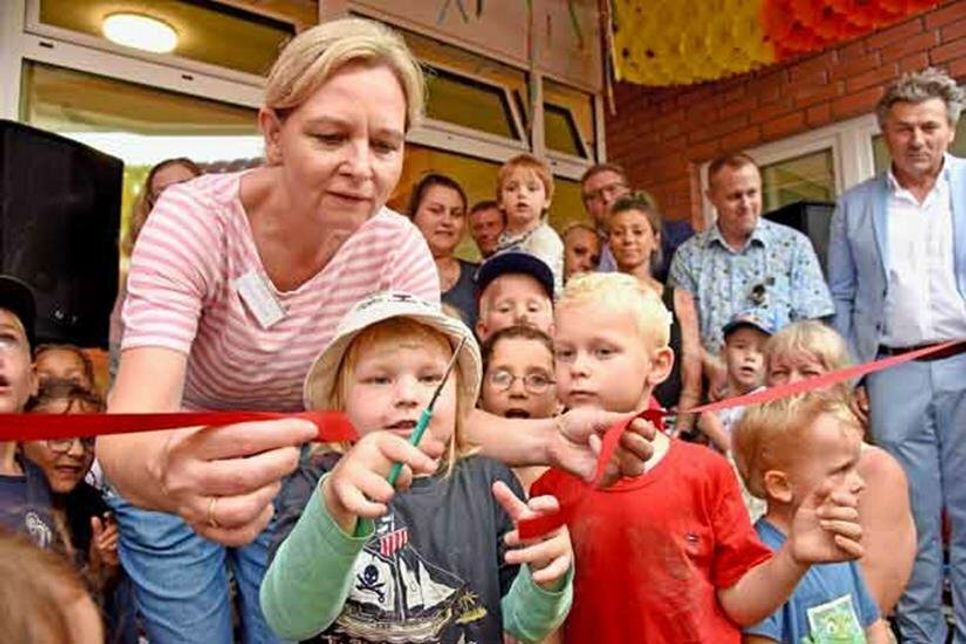 Nach einem Gebet und einem von den Kindern enthusiastisch gesungenen Lied übernahmen es die kleine Thea und Erzieherin Jutta Fleimisch-Hoff, das vor dem Eingang gespannte rote Band mit einer Schere zu durchtrennen und die Gäste zur Besichtigung des Hauses einzuladen und bei Kaffee und Kuchen zu feiern.