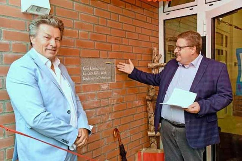 Der beim Kirchenkreis für das Kita-Werk zuständige Propst Dirk Süssenbach enthüllte gemeinsam mit dem Ahrensböker Bürgermeister Andreas Zimmermann den Setzstein mit dem Namen „Lämmerwiese“ am Eingang der Kita. Ein vielsagender Name, den Kinder, Eltern und Erzieherinnen ausgewählt hatten und der quasi eine sprachliche Symbiose der vier Kita-Gruppen zum Ausdruck bringt: Neben einer Lämmergruppe und einer Raupengruppe für Kinder unter 3 Jahren (U3) gibt es nämlich die Schafgruppe und die Schmetterlingsgruppe für Kinder ab 3 Jahren (Ü3) – und das alles auf einem Gelände, das früher Ackerland und Wiese war.