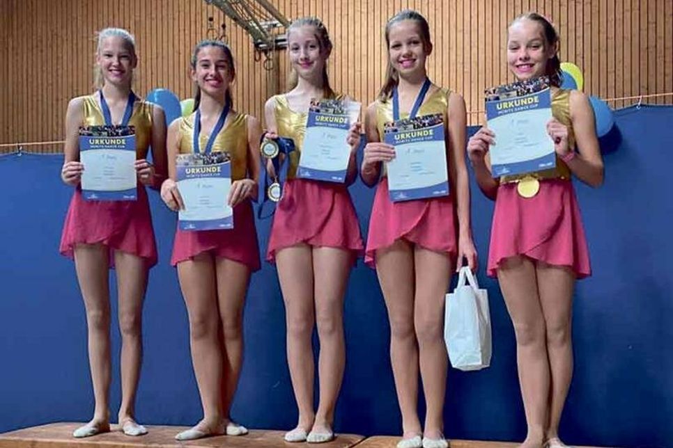 Der Einsatz wurde mit dem 1. Platz, sowie einem Platz im kleinen Finale am Abend belohnt. „Ein ganz besonderes Erlebnis in einem anderen Ambiente nochmals tanzen zu dürfen,“ freute sich Heidi Balk. Am Nachmittag zeigten die Tänzerinnen mit Pflicht- Synchron Übungen der rhytmischen Sportgymnastik ihre Vielseitigkeit. Zu zweit zeigten sie in drei Übungen, mit Ball, Band und Keulen ihr Können. Über den langen Nachmittag blieben sie konzentriert und nervenstark und präsentierten solide Übungen. Die Neulinge Wilhelmine Pinn und Lene Lassen, sowie Ava Pinn und Emma Ballnus belegten einen guten 10. und 9. Platz. Platz 3 belegten Frida Pinn und Emily Balszunat. Èmy Dethlefsen und Hedda Jäde sicherten sich Platz 2 und über den 1. Platz konnten sich Cara Frederick und Leni Mund freuen. Mit den Mädchen freute sich Trainerin Heidi Balk und die Kampfrichterinnen Hilde Reimann und Ina Kühnel.