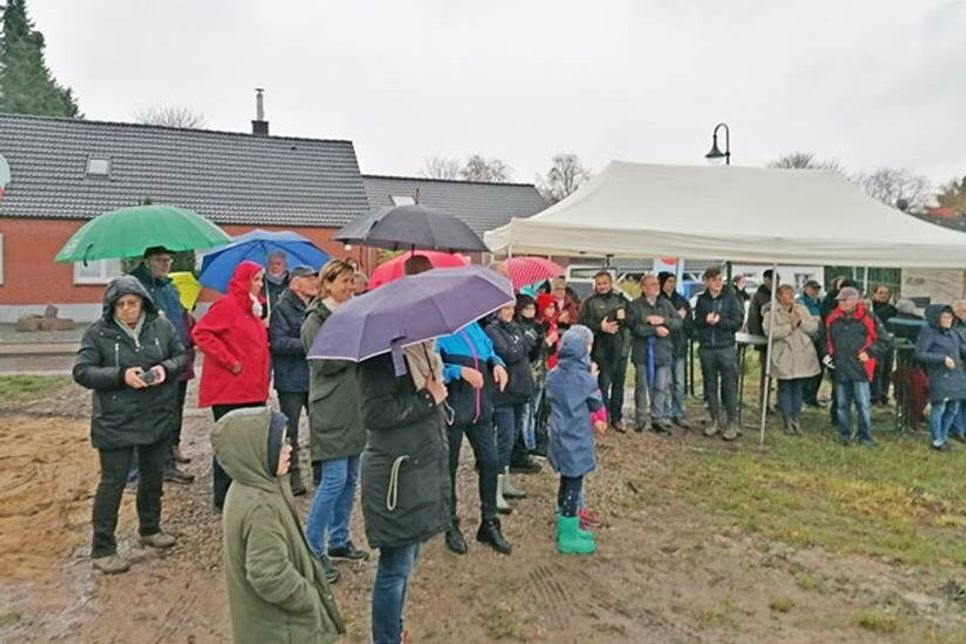 Glasau (t). Die Vorfreude auf den neuen MarktTreff ist groß: Das war allen deutlich anzumerken, die beim Spatenstich für den Bau des Zukunftsprojektes der Gemeinde Glasau dabei waren. Trotz des schlechten Wetters ließen es sich gut 70 Bürgerinnen und Bürger nicht nehmen, beim Baustart live dabei zu sein. Bürgermeister Henning Frahm freute sich über die vielen Gäste und gab einen kleinen Abriss über den Weg von der Idee bis hin zur Umsetzung zum Bau des MarktTreffs. Die Planungen begannen bereits 2018, eine Arbeitsgruppe beschäftigte sich intensiv mit den verschiedenen Möglichkeiten zur Schaffung einer Nahversorgung vor Ort. Schnell stand fest, dass die landesweit etablierte MarktTreff-Idee mit seinen drei Säulen Kerngeschäft, Dienstleistung und Treffbereich für Glasau die passende Lösung sein wird. Mit Unterstützung der ews group, landesweiter Partner für die MarktTreff Gemeinden, einen Standortcheck, einer Bürgerbefragung mit einer Rücklaufquote von 60 Prozent sowie der Erstellung einer Machbarkeitsstudie durch das Hamburger Büro Consult Mensing wurden wesentliche Voraussetzungen geschaffen. Mit dem Architektenbüro Gebrüder Schmidt wurde in Rekordzeit ein für die Gemeinde Glasau passender Bauentwurf vorgelegt und finalisiert. Im Mai 2020 gab es die Nachricht vom Landesamt für Landwirtschaft, Umwelt und ländliche Räume (LLUR) über eine Förderung des Projektes mit einer Summe von 750.000 Euro, zusätzlich konnten Kreismittel über 50.000 Euro eingeworben werden. Die Gemeinde konnte im Sommer 2020 das Grundstück erwerben, im Frühjahr 2021 lag die Baugenehmigung vor und letzte Detailplanungen folgten. Die Ausschreibungen und Auftragsvergaben erfolgten im Sommer 2021 und am 4.11.2021 konnte mit dem ersten Spatenstich der Baustart erfolgen. Es wird mit einer Bauzeit von 12 Monaten gerechnet, so dass die Fertigstellung im Herbst 2022 erwartet wird.