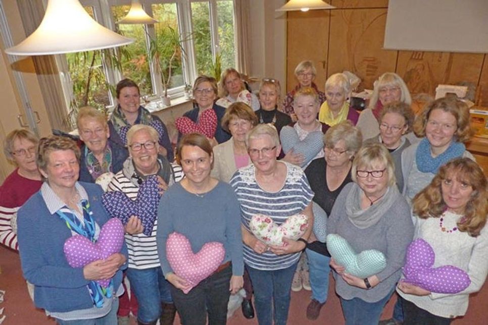 Rund 50 Kissen schaffen die LandFrauen in der Regel an einem Nachmittag – „aber wir haben heute so viele Gäste”, strahlt Heidrun Behrens, „dass wir vielleicht noch viel mehr schaffen.” Die Kissen werden dann allesamt dem Brustkrebszentrum Ostholstein übergeben, wo sie an Frauen verschenkt werden, die nach einer Brust-OP hier versorgt werden. Die Kissen schmiegen sich dank ihrer Form und ihrer perfekten Füllung genau unter den Arm und entlasten den nach der OP schmerzenden Bereich, sie reduzieren Schmerzen, die durch Verspannungen oder Schwellungen entstehen und puffern Stöße ab. Außerdem stützt das Herzkissen den Oberkörper beim Husten. Dass die Kissen wirklich Entlastung schenken, weiß ein Großteil der LandFrauen aus eigener Erfahrung. So wie Annegret Krabbenhöft, Gründungsmitglied der Bosauer LandFrauen, die vor zweieinhalb Jahren Brustkrebs bekam – „das Herz ist so schön weich, es tut einfach gut, es unter den Arm zu klemmen. Vor allem aber freut man sich drüber.” Eine weitere LandFrau, die vor einigen Jahren an der Brust operiert werden musste, erzählt, dass sie sich damals gefreut hätte, wenn es die Herzkissen schon gegeben hätte – umso glücklicher sei sie nun, dabei zu helfen, dass heute jede Frau eines bekomme, die es brauche.