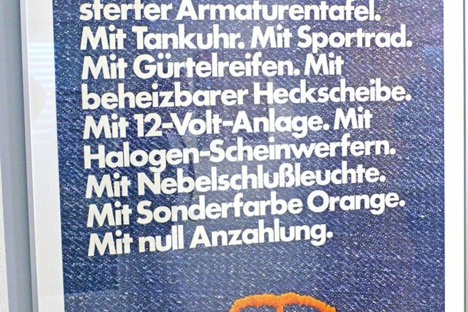 Schon im Treppenhaus empfängt eine zauberhafte Werbung von Volkswagen die BesucherInnen: Eine junge Frau mit Glockenhut hält verträumt ihren Autoschlüssel in der Hand und drüber steht: „Weil er zu mir passt“. „Und es ist ganz klar, dass es hier um den Käfer geht“, lacht Dr. Julia Hümme, die Leiterin des Ostholstein Museums. „Denn bei der Volkswagenwerbung der 60er und 70er ging es immer vor allem um den Käfer.“ Besonders schön ist das Plakat im ersten Stock, das in Jeansblau und mit einem gestickten Käfer in Orange die komplette Ausstattung des deutschen Kultautos bewirbt – und obwohl es fast eine Abhandlung ist statt der sonst üblichen markigen Slogans, ist es doch irgendwie kein Wort zuviel sondern erinnert an das Gefühl, in einem klapprigen Käfer durch die Lande zu sausen. Zumindest, wenn man alt genug dafür ist, sich an die Zeit der Käfer zu erinnern – für Kinder der 60er, 70er und 80er ist diese Ausstellung eine Reise in ihre Kindheit. Dazu muss man weder Auto- noch Kunst-Fan sein, denn Autowerbung war (und ist) allgegenwärtig und veränderte sich mit der Gesellschaft und der Politik, mit Zeitgeist und -geschehen. „“Obwohl die Autoindustrie sicherlich mit das größte Budget für Werbung zur Verfügung hat und das auch einzusetzen weiß“, so Dr. Julia Hümme, „unterliegt sie doch auch wie kaum eine andere gesellschaftlichen und politischen Strömungen. So gesehen sind diese Plakate echte Zeitdokumente.“