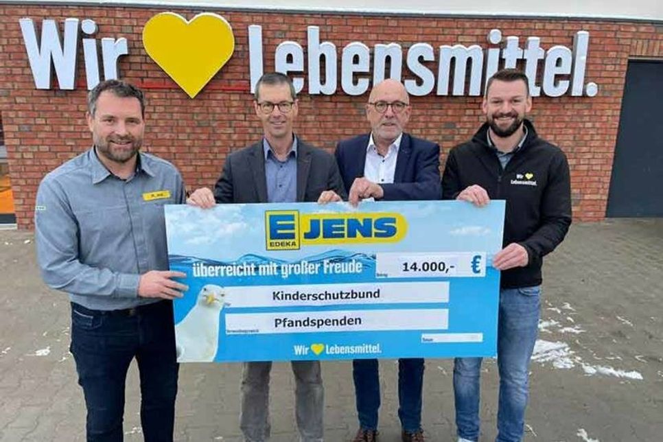 Schönwalde. (hfr) Erneut haben die Kundinnen und Kunden der EDEKA Jens Märkte in Schleswig-Holstein und Mecklenburg-Vorpommern ein Jahr lang fleißig zigtausende Pfandbons gespendet. Eine stattliche Summe kam zusammen und wurde von den Jens Märkten großzu¨gig auf 14.000 € aufgerundet. Diesmal ging die Spende an den Deutschen Kinderschutzbund. Henning Reimann, Geschäftsfu¨hrer des Kreisverbandes Ostholstein und Carsten Spies, Geschäftsfu¨hrer des Landesverbandes in Mecklenburg-Vorpommern, nahmen den symbolischen Scheck dankbar von den Geschäftsfu¨hrern der Jens Märkte Reimer Jens und Swen Rathjens entgegen. In Mecklenburg-Vorpommern wird man mit dem Geld das Kinderrechte- und Spielmobil unterstu¨tzen. Die Spendenu¨bergabe fand im ku¨rzlich neu eröffneten EDEKA Jens Markt in Schönwalde a. B. Statt. Am 01.12.2022 ging es dann gleich wieder in die nächste Runde. Seitdem werden in nunmehr 10 EDEKA Jens Märkten die Pfand-Spenden ein Jahr lang fu¨r die Pfadfinderinnen und Pfadfinder gesammelt. Seit Start der Pfandspendenaktion im Jahr 2014 konnte bisher insgesamt die stolze Summe in Höhe von 95.111 € an die verschiedene Organisationen u¨bergeben werden. Allen Kundinnen und Kunden sei herzlichst fu¨r Ihre Spenden gedankt.