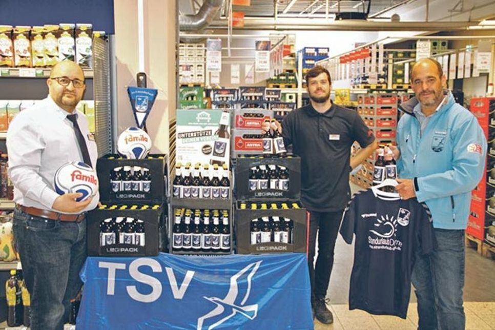 TSV Dahme steht auf den Flaschen, die es beispielsweise im famila-Warenhaus am Voßberg 1 zu kaufen gibt. „Wir freuen uns auf die neue Saison und hoffen auf möglichst viele Unterstützer. Die durch die Corona-Pandemie hart getroffenen Klubs haben für ihre wertvolle Vereinsarbeit jede Hilfe verdient“, sagt Selim Altindagoglu und ergänzt freudestrahlend, dass der Verkauf schon ganz gut angelaufen sei. Begeistert bei dieser Aktion mitmachen zu können, zeigte sich auch der 1. Vorsitzende des TSV Dahme, Andrew Bednarzik. „Wir werden unter anderem das Bier in unserem Vereinsheim an unsere Fans und die Fans der gegnerischen Mannschaften ausschenken“, verriet er schmunzelnd zum Pressetermin mit Herrn Altindagoglu (links im Bild) und famila-Getränkemarktmitarbeiter Christian Knoop (Bildmitte, im Hintergrund).