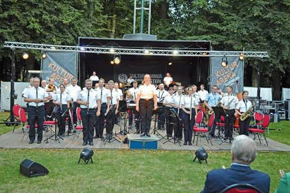 Oberstleutnant Ruhland war erfreut und überrascht zugleich: „Diese Auszeichnung trifft mich unvorbereitet. Der Dank gilt auch den vorherigen Kommandanten. Dass ich diese Auszeichnung entgegennehmen darf, ist pures Glück!“ Ruhland hatte zuvor das Benefizkonzert eröffnet, alle Freunde der guten Musik herzlich begrüßt und an Kapitänleutnant Inga Hilsberg übergeben. Die Leiterin des Marinemusikkorps moderierte witzig und spritzig durch den Abend. „Wer im Mai nicht bei dem Konzert im Schützenhof dabei war und mich nicht kennt: Ich bin die Neue“, präsentierte sich die Dirigentin, die im Februar diesen Jahres die Orchesterleitung übernommen hatte. Die gut besuchte Kultur Arena erwartete ein bunter Reigen an Orchesterklassikern. Von Komponisten wie John Williams, Klaus Strobl, Alfred Reed bis hin zu Stücken von ABBA und Roland Kaiser. Ob der klassische Marsch, symphonische Blasmusik oder Musical und Pop – die verschiedensten Musikstile begeisterten die Menschen auf dem Schützenplatz bei herrlichstem Holsteiner Sommerwetter. Zum Schluss bedankte sich das Orchester bei den Gästen dafür, dass diese die Kultur unterstützten und somit am Leben erhielten. Der Dank der Musiker galt auch Oberstleutnant Ruhland für die Einladung, in Oldenburg zu spielen.