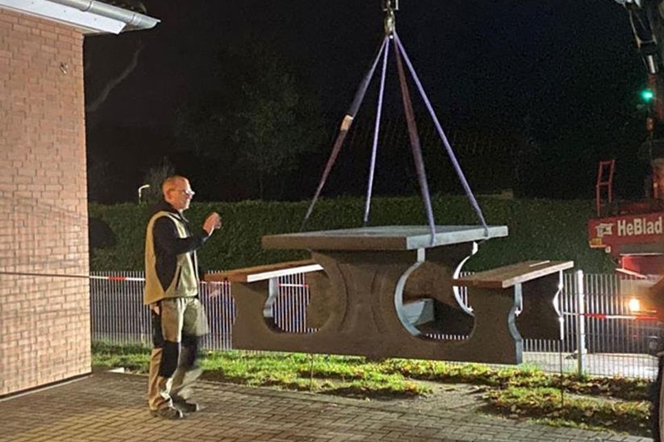 ln den Herbstferien wurde der Tisch dann aus Holland geliefert. Pünktlich um 6.00 Uhr nahmen Christel Albrecht (Leitung lnsel) und Herr Frank Paustian (Hausmeister) die Lieferung entgegen. Schnell war ein passender Platz für den 850 kg schweren Tisch gefunden.