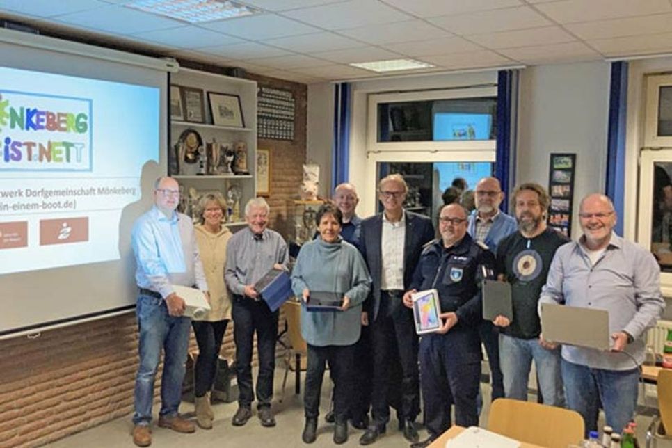 Mönkeberg (t). Der im vergangenen Jahr gegründete Verein „För Mönkeberg“ hat als Initiator des Projektes „Digitales Netzwerk Dorfgemeinschaft Mönkeberg“ für seine geplanten Aktivitäten von der Stiftergemeinschaft der Förde Sparkasse einen Förderbeitrag in Höhe 4.500 Euro erhalten. Am 26. Oktober informierten die beteiligten Netzwerkpartner (Feuerwehr, Förderverein des AWO-Kinderhauses, För Mönkeberg, Seniorenbeirat und Sportverein) im Feuerwehrhaus Mönkeberg den Vorstand der Stiftergemeinschaft Carsten Zarp über den Projektfortschritt und präsentieren die mittels der Fördermittel beschaffte Ausstattung (Notebooks, Tablets, iPads, Beamer).