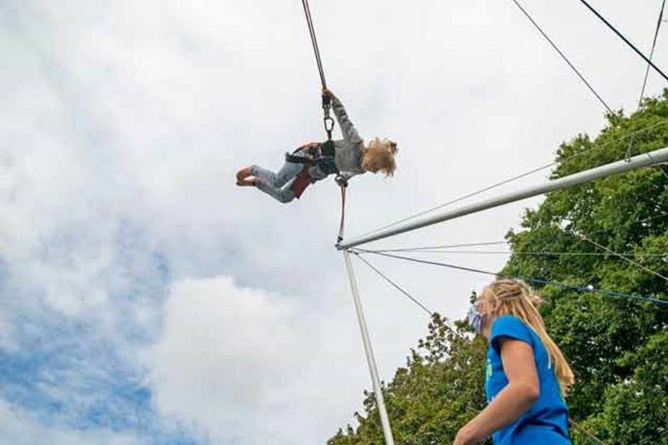 Sportlich ist auch das Angebot beim Quattro Highjump. Die Sprungeinrichtung hat es „in sich“ und ist bekanntlich nichts für schwache Nerven. Der Fun-Faktor ist hoch. Bis zu neun Meter Höhe – nur Fliegen ist schöner – können die Teilnehmer beim Springen erreichen. Auch hier steht das Gemeinschaftserlebnis im Vordergrund: Bis zu vier Springer können beim Quattro Highjump zur gleichen Zeit in die Luft gehen. Für ihren spektakulären Höhenflug werden sie an Gummiseilen festgemacht – und los geht’s.