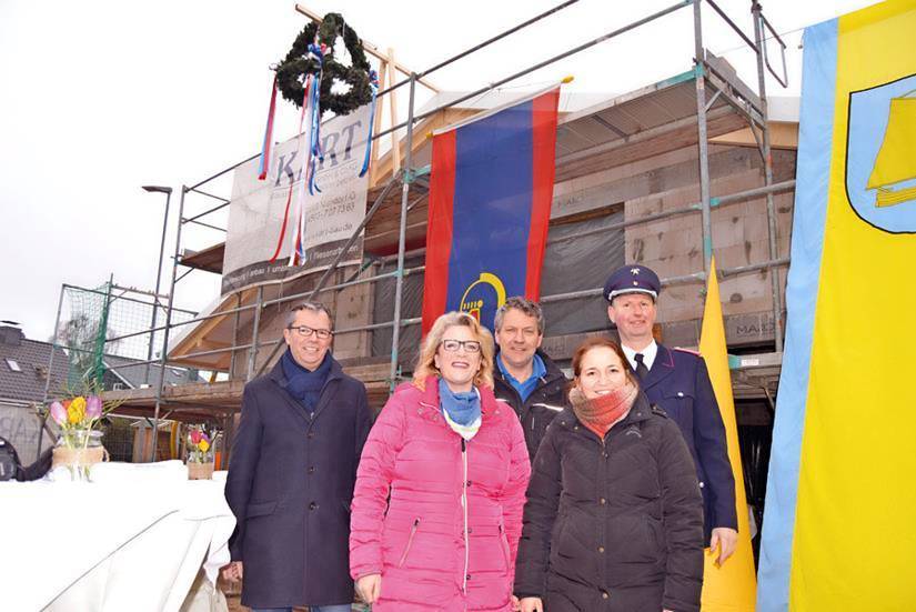 Groß Timmendorf. Ein weiteres Etappenziel für das neue Dorfgemeinschafts- und Feuerwehrgerätehaus in Groß Timmendorf ist erreicht. Am vergangenen Freitag wurde Richtfest gefeiert. Das Gebäude entsteht an der Stelle, an der die einstige Dorfschule ihren Platz hatte. „Ein ganz neuer Mittelpunkt wird geschaffen“, sagte Timmendorfs Bürgermeisterin Hatice Kara, nachdem sie aus luftiger Höhe die zahlreichen Gäste gleich neben der Richtkrone vom Baugerüst aus begrüßt hatte. Die Grundfläche des Gebäudes liegt bei knapp 390 Quadratmetern, die Gesamtnutzfläche beträgt rund 420 Quadratmeter. Für die Feuerwehr entsteht eine Fahrzeughalle von 81 Quadratmeter Größe für das geplante neue Einsatzfahrzeug LF 10, ein Lagerraum, getrennte Umkleideräume mit Sanitärbereichen und ein Reinigungsraum für Atemschutzgeräte. Im Obergeschoss finden Lagerraum, ein Büro für Lehrmittel sowie ein in der Mitte teilbarer Schulungsraum Platz. Zusätzlich entstehen 13 Pkw-Stellplätze. Die Dorfgemeinschaft kann in Zukunft in ihren Räumlichkeiten Versammlungen sowie Veranstaltungen für maximal 70 Personen durchführen. Küche und WC-Anlagen sowie sieben Pkw-Stellplätze gehören ebenso zum Dorfgemeinschaftshaus. Insgesamt kostet die Maßnahme 1,42 Millionen Euro. Für die Umsetzung erhält die Gemeinde Timmendorfer Strand Fördermittel in Höhe von 750.000 Euro. Die Förderung wird aus GAK-Mitteln (Gemeinschaftsaufgabe „Verbesserung der Agrarstruktur und des Küstenschutzes”) zur Förderung der Dorfentwicklung vom Landesamt für Landwirtschaft, Umwelt und ländliche Räume gestellt. „An dieser Stelle bedanke ich mich herzlich bei dem Fördergeldgeber“, sagte Kara auch in Richtung der anwesenden Regionalmanagerin der Aktiv Region Lübecker Bucht, Tanja Schridde. Einmal mehr hatte sie in Sachen Förderung Maßarbeit geleistet hatte. Im Rahmen der Feierlichkeiten bedankte sich Ortswehrführer Thomas Brede bei allen, die zum bisherigen Gelingen beigetragen haben. Stellvertretend dafür überreichte er Blumensträuße an engagierte Frauen aus der Dorfschaft, die die Richtkrone in Handarbeit gefertigt hatten. Vor dem traditionellen Richtspruch mit Leeren und Zerschlagen eines Schnapsglases hatte Dipl.-Ing. Wolfgang Hargus zuvor zwar deutlich gemacht, dass die Baumaßnahme nicht ganz im Zeitplan liege: „Wir sind mit den Arbeiten nicht so weit, wie wir es sein wollten.“ Schuld daran seien vor allem die widrigen Witterungsverhältnisse der letzten Monate, so Hargus. Architekt Jörn Jahnke und Wehrführer Brede zeigten sich jedoch zuversichtlich, dass der vorgegebene Termin für die Fertigstellung dennoch eingehalten werde. „Juni oder Juli sollten weiterhin realistisch sein“, waren sie sich beide vor dem anschließenden geselligen Teil unter der Richtkrone einig.
