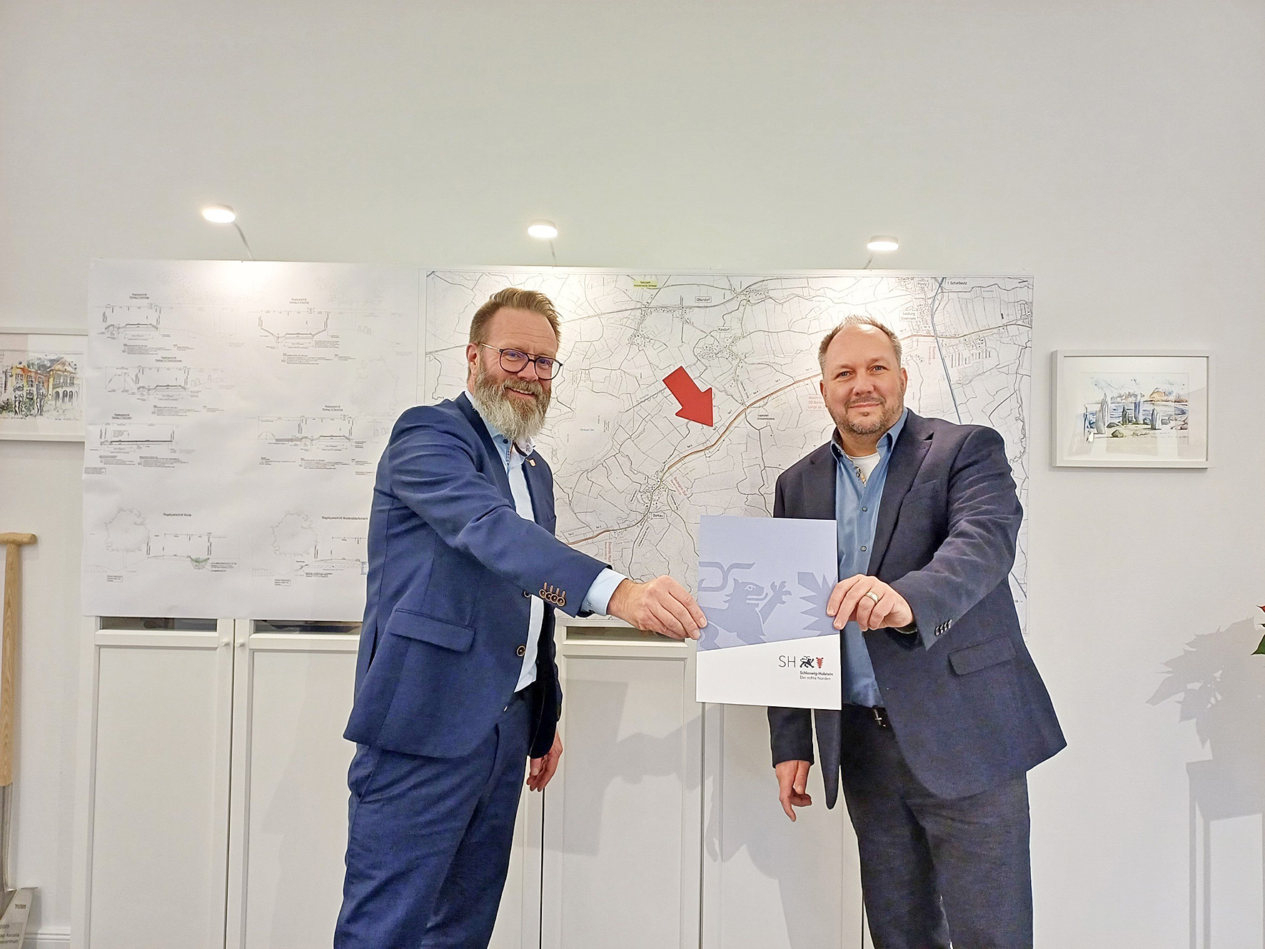 Den Förderbescheid übergab Schleswig-Holsteins Verkehrsminister Claus Ruhe Madsen am 5. Dezember an Landrat Timo Gaarz. „Wir haben uns auf die Fahnen geschrieben, das Radfahren zu fördern. Dafür braucht es als allererstes gute Radwege. Es ist eine großartige Nachricht, dass hier im Kreis das gleiche Ziel verfolgt wird und ein dringend benötigter Radweg gebaut wird. So sind die Menschen in der Region bald deutlich sicherer unterwegs“, sagte Madsen.