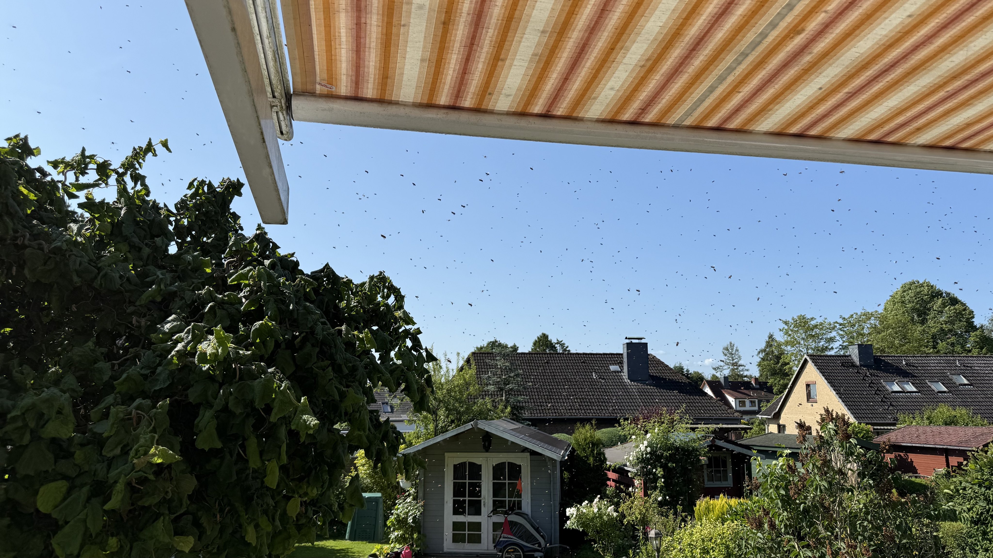 Heute ereignete sich ein seltenes Naturschauspiel im Garten unseres Lesers Sebastian aus dem Vigölensoll über dass auch sein Hund sehr überrascht gewesen sein soll. Ein riesiger Bienenschwarm flog über das Grundstück und alle Anwesenden waren beeindruckt und vielleicht auch etwas verängstigt über die Wucht mit der die kleinen Tierchen herankamen. Sie suchen wohl als Volk eine neue Heimat ihre soziale Kompetenz lässt sie zusammen danach suchen.