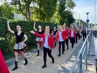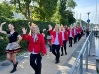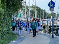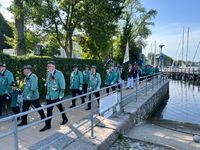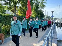 Der Tag begann für die Gildebrüder und -schwestern traditionell bereits in den frühen Morgenstunden mit einem Umzug durch die Stadt. Wie in jedem Jahr ging es mit zahlreichen Gästen aus Politik, Verwaltung und Vereinsleben über den Netztrockenplatz der Fischer bis zum Gogenkrog, wo man schließlich zum Frühstück einkehrte.