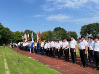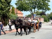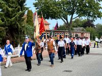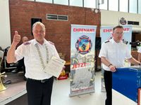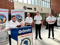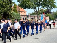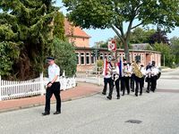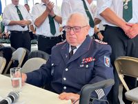 Nach dem Königsfrühstück folgte der große Festumzug durch den Ort, der wieder jede Menge Schaulustige begeisterte. Nach dem Vogelrichten auf dem Gildeplatz begann der Festkommers in der Gildehalle unter der Leitung von Ortswehrführer Jacob Revenstorf, der sich bei allen Kameradinnen und Kameraden für ihren ehrenamtlichen Einsatz bedankte und eine nicht ganz alltägliche Ehrung durchführen konnte. Ernst Gloy wurde für 60 Jahre Mitgliedschaft bei der FFW Grömitz ausgezeichnet und nahm sichtlich gerührt, diese besondere Ehrung entgegen. Außerdem verabschiedete Revenstorf Marc Herrmann nach 18 Jahren Tätigkeit als Gruppenführer aus den Reihen des Vorstands und beförderte Tim Muchow, auf Grund seiner Wahl zum Gruppenführer, zum Hauptfeuerwehrmann 3 Sterne.
