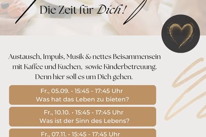 Neustadt in Holstein. Am Freitag, dem 5. September lädt die Freie evangelische Gemeinde von 15.45 bis 17.45 Uhr zum Themennachmittag im Rahmen des Frauencafés ein. Dieses Mal steht das Thema „Was hat das Leben zu bieten?“ im Mittelpunkt. In gemütlicher Atmosphäre mit Kaffee, Kuchen und musikalischem Rahmen geht es um Austausch, Impulse und Gespräche rund um die Schätze christlicher Spiritualität. Auch Kinderbetreuung wird angeboten. Veranstaltungsort ist die Freie evangelische Gemeinde, Am Binnenwasser 5. Eine Anmeldung ist per E-Mail an frauencafe-feg@gmx.de erforderlich. Für die Kinderbetreuung wird um Angabe von Anzahl und Alter der Kinder gebeten. (red)